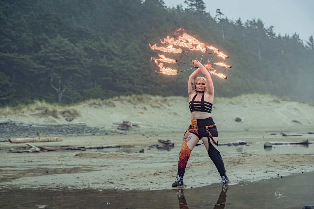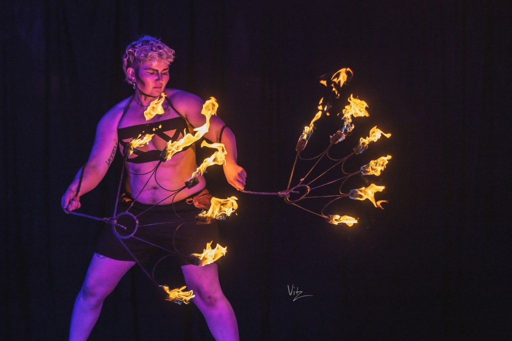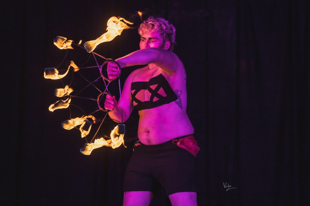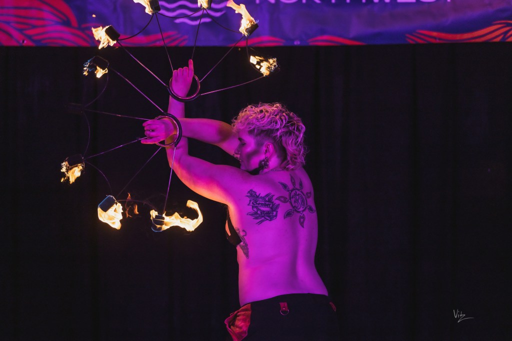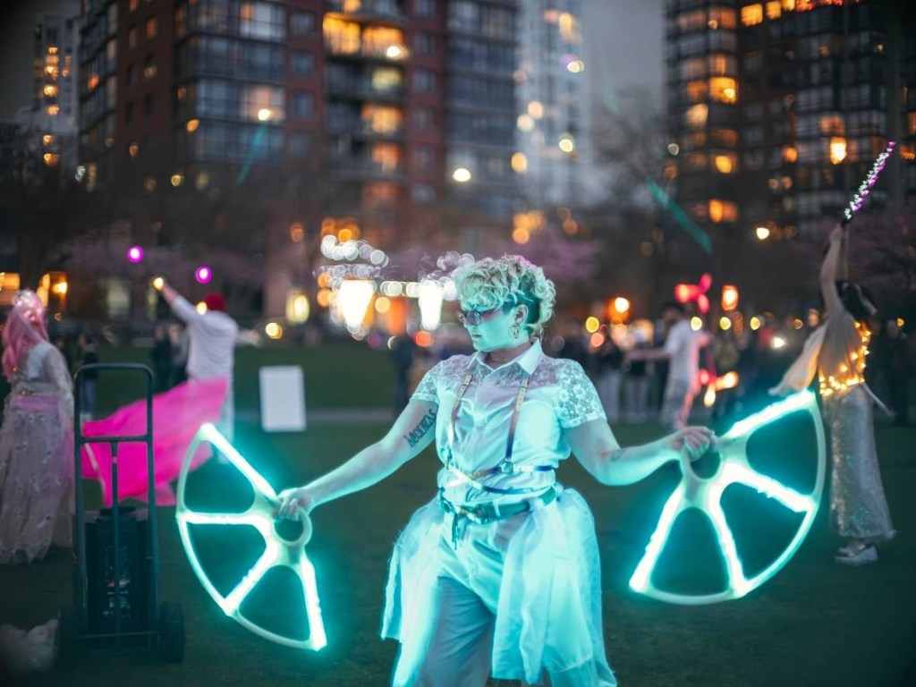 Checkers began their flow arts journey in 2011 in Denver, Colorado. Meeting a vibrant community, they picked up fire fans and haven’t put them down since. They have developed a unique spinning style that combines traditional weaves with technical symmetry breakdowns. Following their love of flow arts, Checkers also spins hoops, dragon staff, and poi. Since 2023, they have brought several workshops to events and groups in the Pacific Northwest and Lower Mainland, and also offer 1-1 lessons to local fan spinners.