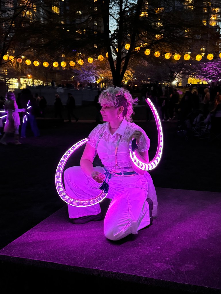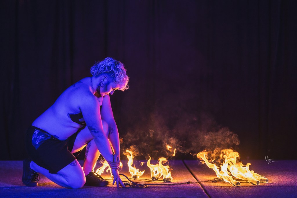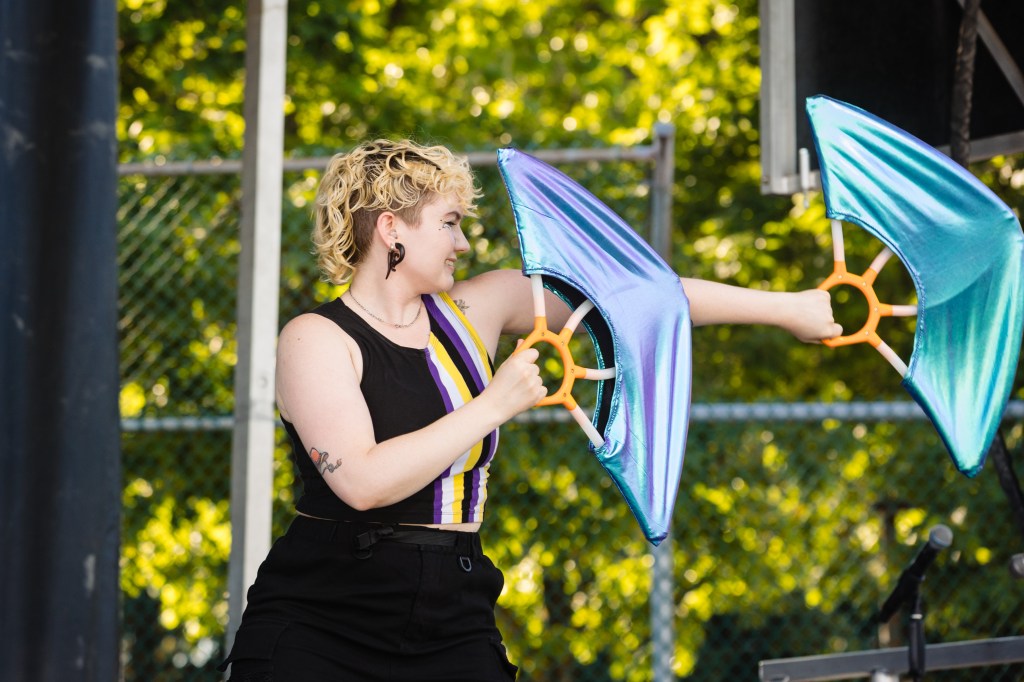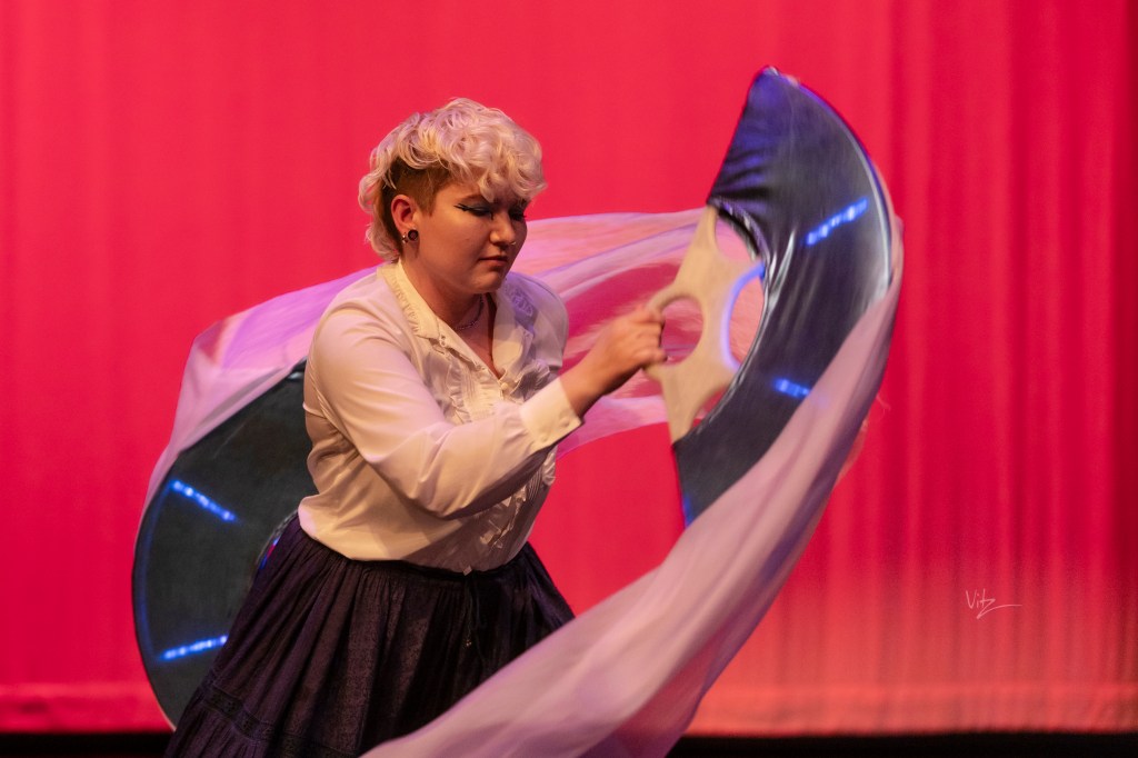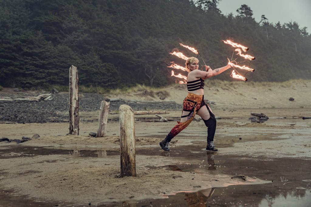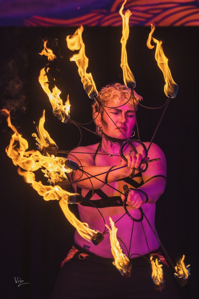 Checkers began their flow arts journey in 2011 in Denver, Colorado. Meeting a vibrant community, they picked up fire fans and haven’t put them down since. They have developed a unique spinning style that combines traditional weaves with technical symmetry breakdowns. Following their love of flow arts, Checkers also spins hoops, dragon staff, and poi. Since 2023, they have brought several workshops to events and groups in the Pacific Northwest and Lower Mainland, and also offer 1-1 lessons to local fan spinners.